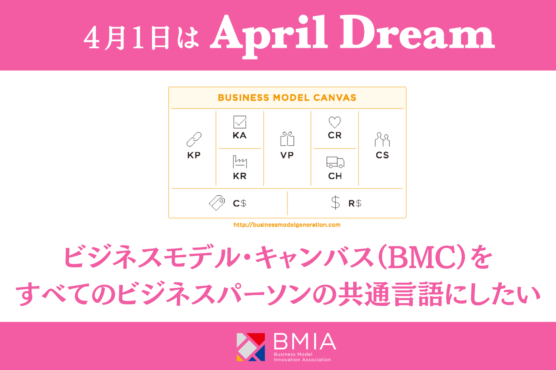 それらを網羅した、ひと目でそのビジネスが分かる「ビジネスモデル・キャンバス(BMC)」を、みんなが知るツールに、ビジネスパーソンの共通言語にしたい! それが大きな夢への第一歩です。
