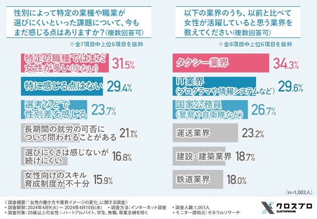 「性別によって特定の業種や職業が選びにくいといった課題について、今もまだ感じる点はありますか?(複数回答可)」と質問したところ、『特定の職種ではまだ女性が多い(少ない)(31.5%)』と回答した方が最も多く、次いで『特に感じる点はない(29.4%)』『選考などで性別差を感じる(23.7%)』と続きました。