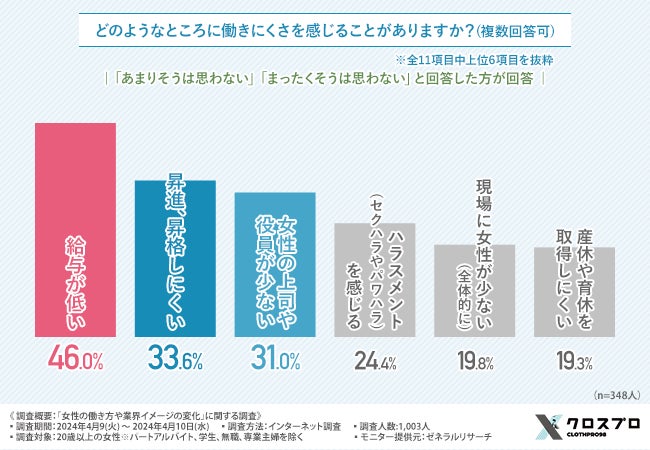 次に、「あまりそうは思わない」「まったくそうは思わない」と回答した方に「どのようなところに働きにくさを感じることがありますか?(複数回答可)」と質問したところ、『給与が低い(46.0%)』と回答した方が最も多く、次いで『昇進、昇格しにくい(33.6%)』『女性の上司や役員が少ない(31.0%)』と続きました。