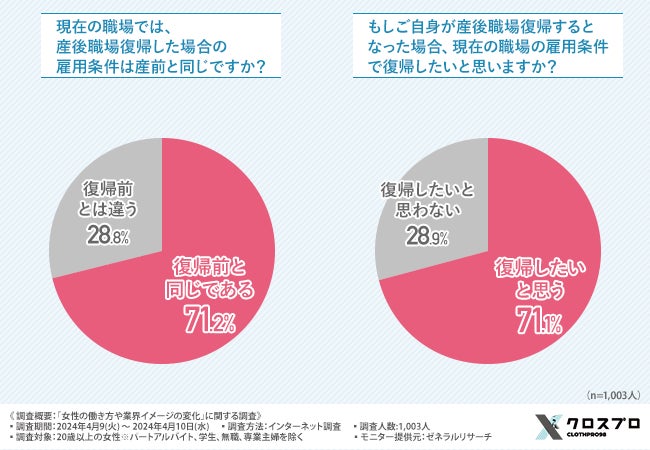 また、「現在の職場では、産後職場復帰した場合の雇用条件は産前と同じですか?」と質問したところ、約7割の方が『復帰前と同じである(71.2%)』と回答しました。