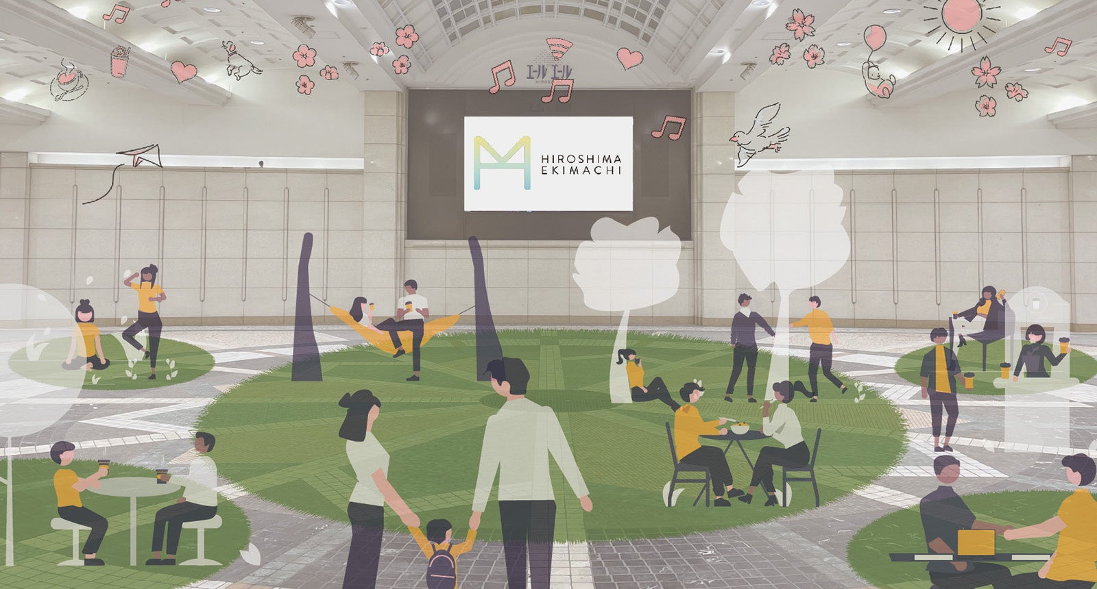 広島駅南口地下広場では、イベント広場の周りへのパネル設置による「たまりの空間」を創出。「駅」「街」「待ち(合わせ)」「地下」「近(い)」などの意味を持たせた『エキマチカPLACE』と名付け、ホール空間としてのイベント利用や、日常的なくつろぎスペースとしての活用の可能性を検証します。