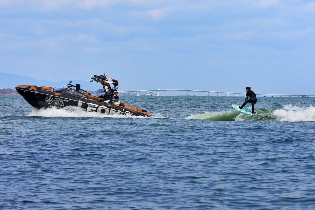 ウェイクサーフィンとは走行する船の曳き波を利用した新しいマリンスポーツです。人工的に波を作るので波の待ち時間がなく、船が走行する限りエンドレスで波に乗り続けられます。