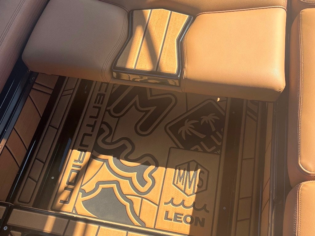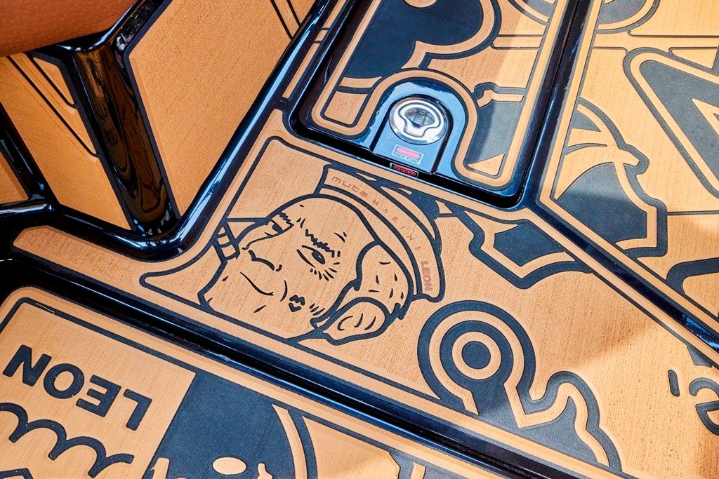 船内のマット、ソファ部分にmuta MARINEや「LEON」のロゴが配されています。また、マットの1か所には「LEON」のメインキャラクターである「ジローラモ」氏のイラストも盛り込まれており、特別仕様感を演出しています。