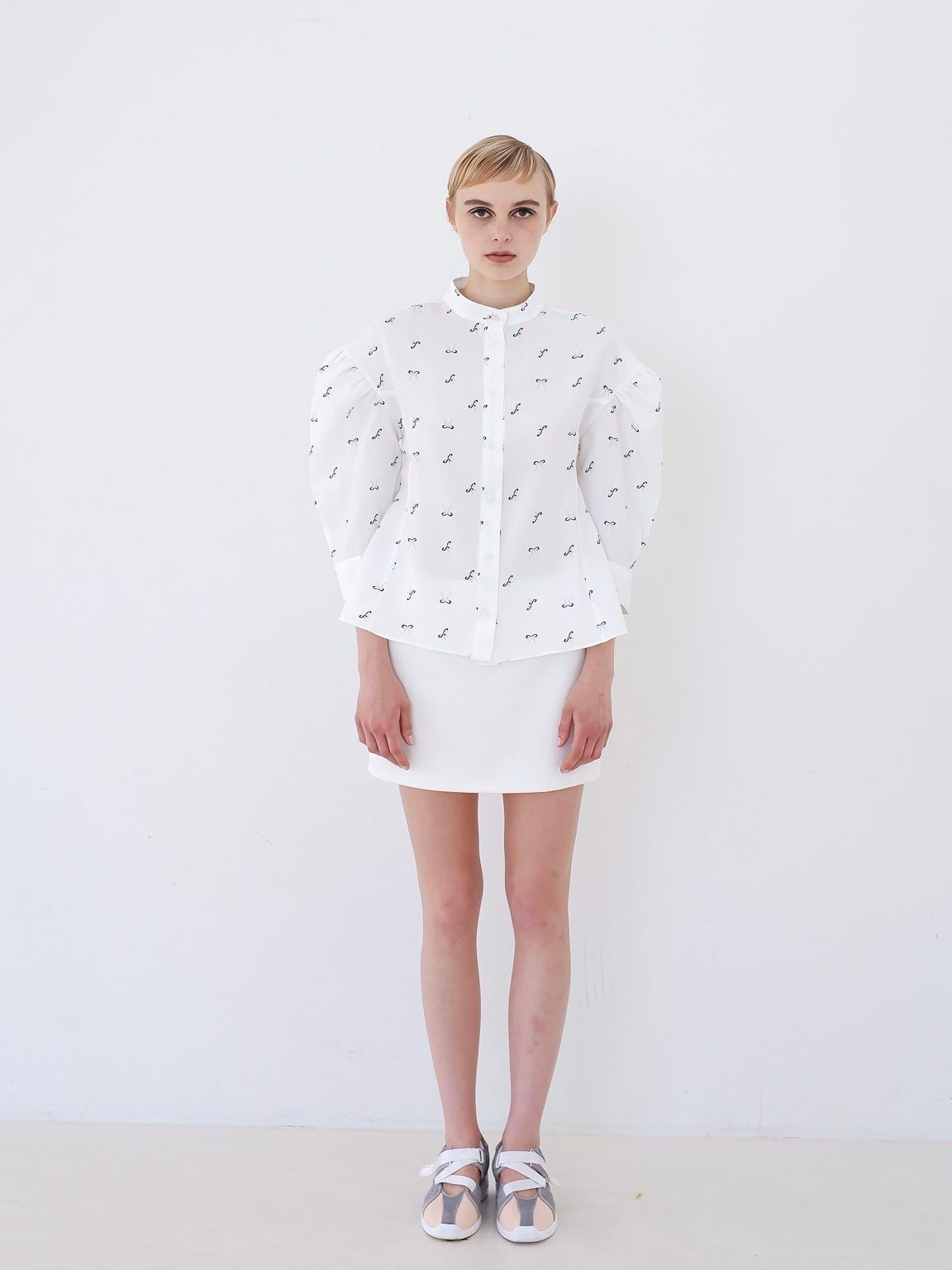 タックインすることでボリュームを出した構築的な袖と、デコルテを綺麗に見せる