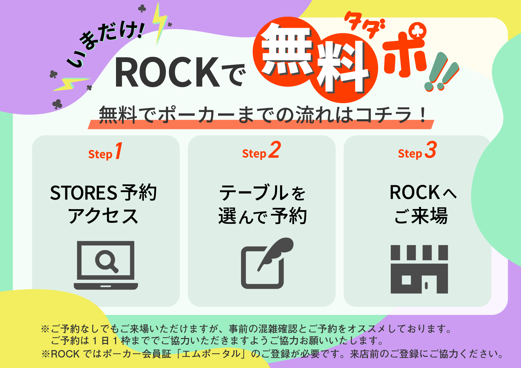ROCKにてご予約メール画面の提示と、ポーカー会員証「エムポータル」の会員登録を行い、ゲームスタート!