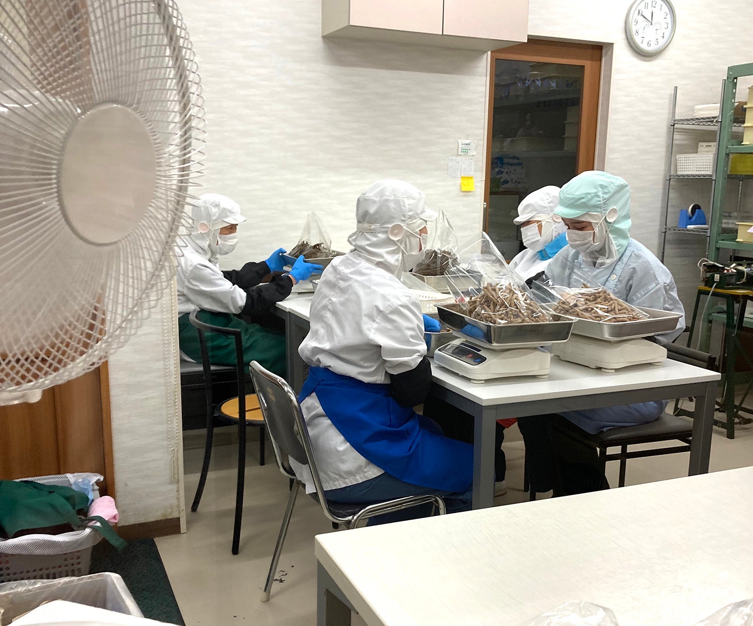 メンマを製造する工房にて、「たけのこかえし」を利用者と共に