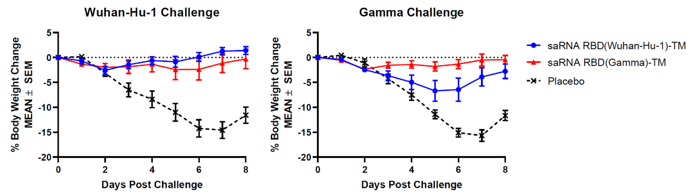 図3.レプリコンRBD(ガンマ株)-TMを2回接種したハムスターでは、新型コロナウイルス武漢株およびガンマ株での攻撃接種後に大きな体重変化は確認されなかった