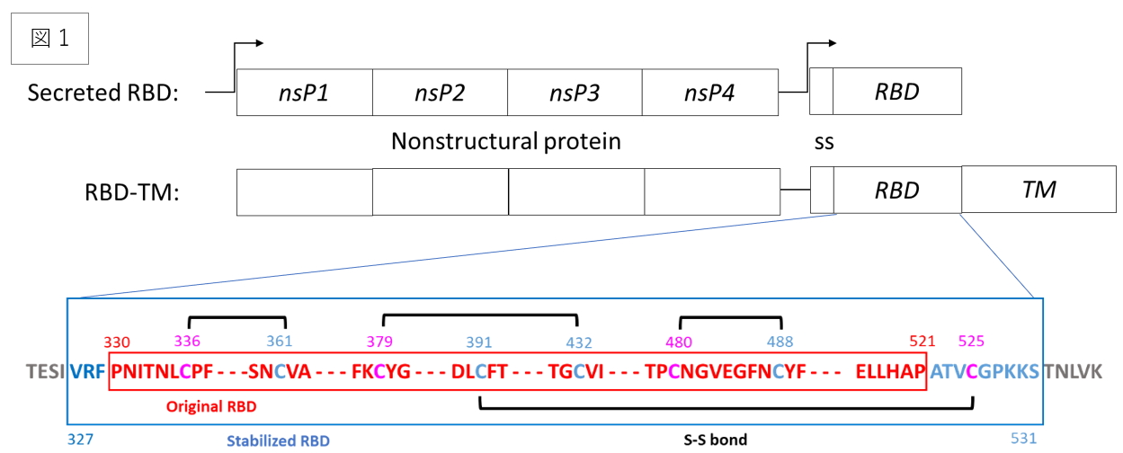 ◇新型コロナウイルスSタンパク受容体結合ドメイン(RBD)を細胞膜上に発現させるレプリコンワクチンをデザインし、開発を行った。