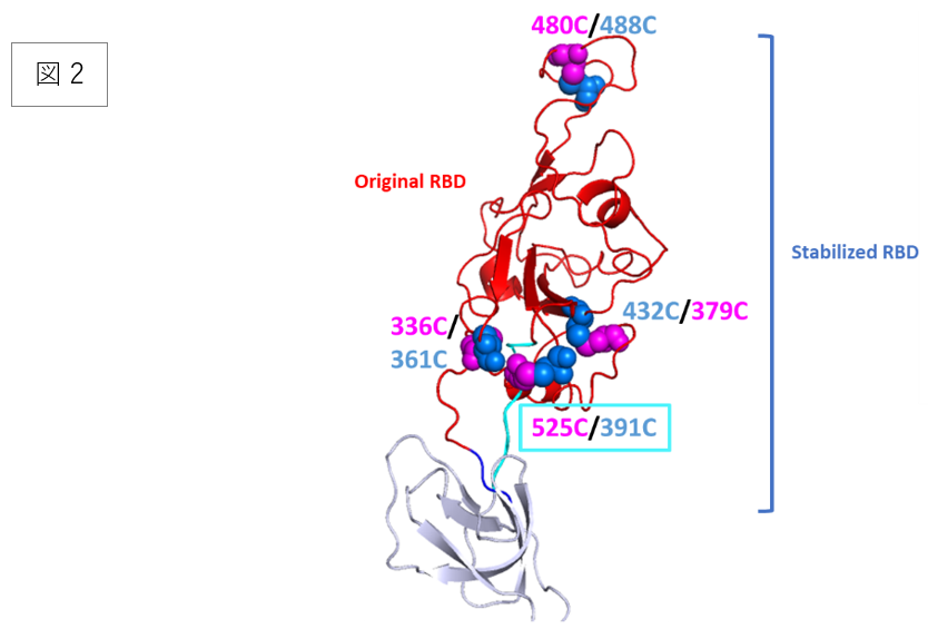 図2.RBD抗原のアミノ酸配列と構造モデルの模式図。赤線で囲われた配列がオリジナルのRBD、青線で囲われた配列が安定化されたRBD、そして黒線がジスフィルド結合を示す
