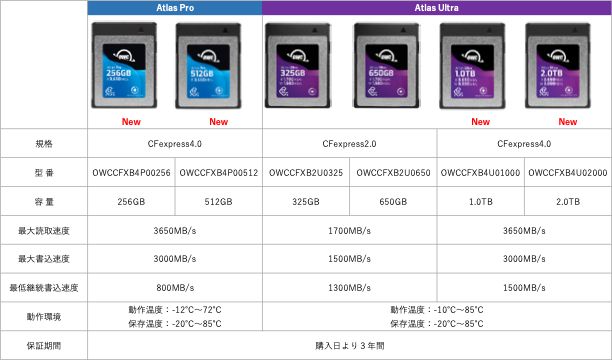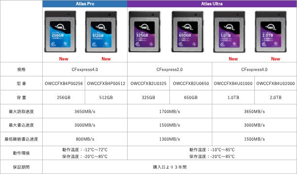 Other World Computing, Inc.(OWC:米国イリノイ州ウッドストック)は、新しいAtlas ProおよびUltraシリーズCFexpress4.0 Type Bメモリーカードを10月13日にAmazon.co.jpで発売いたします。