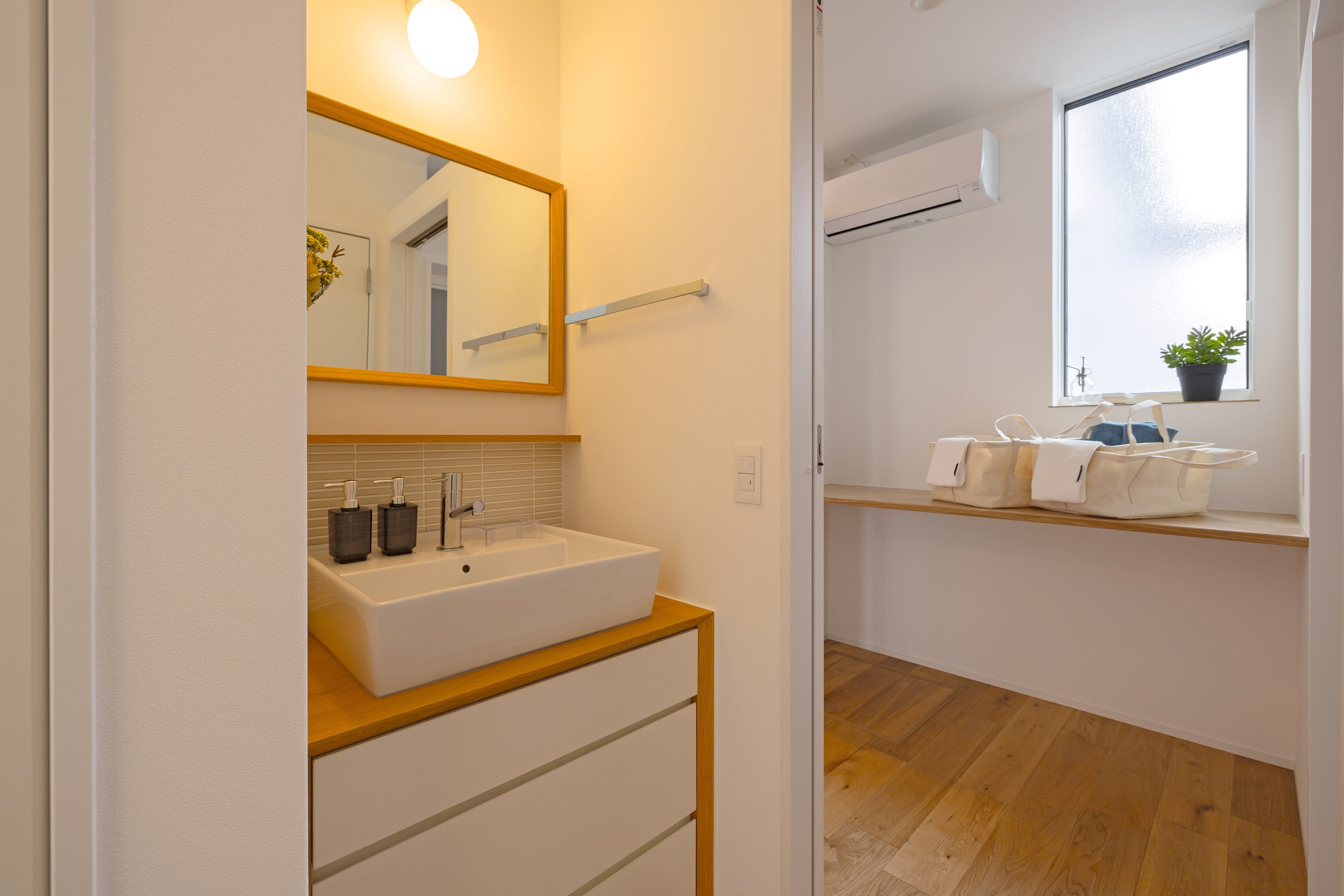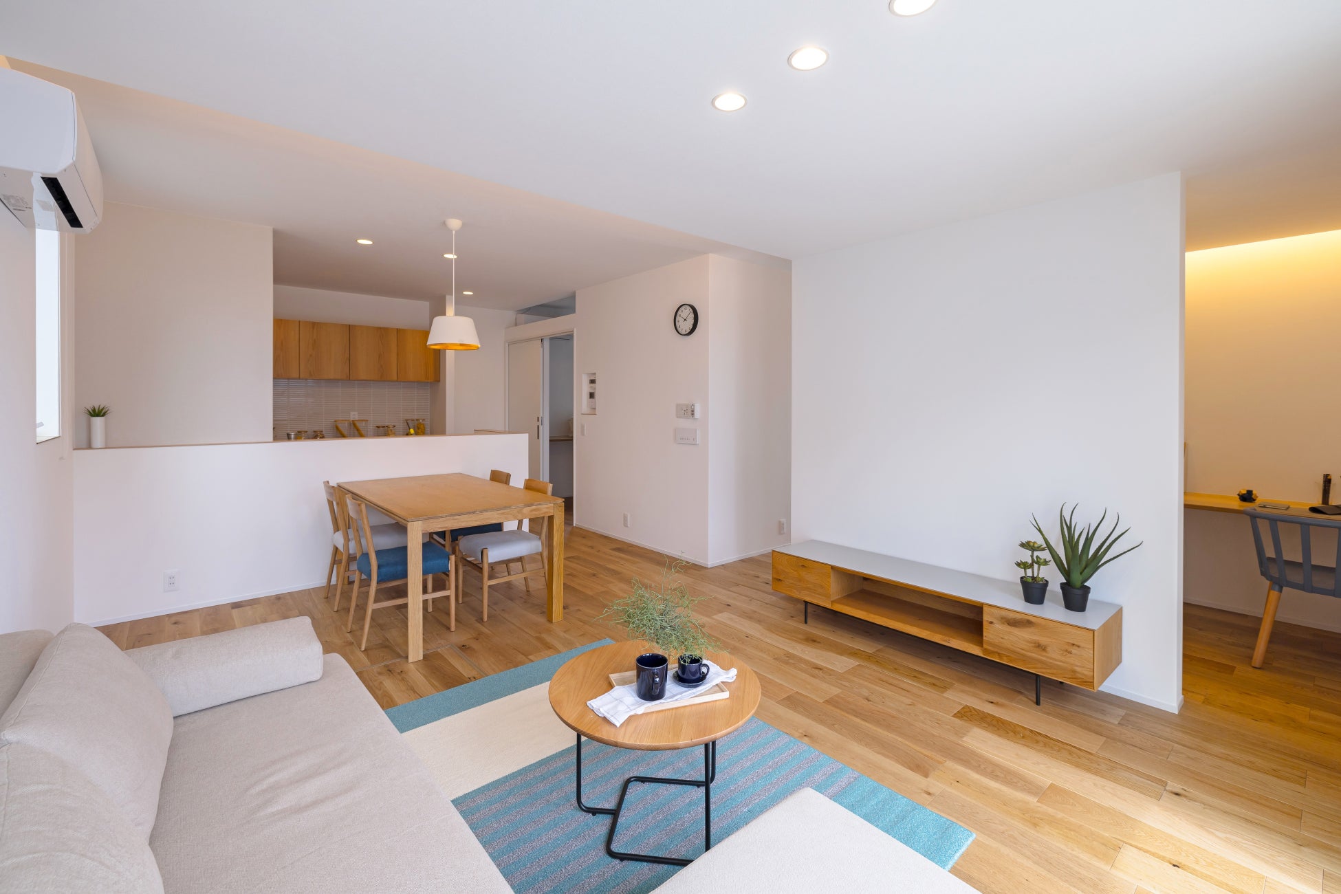 室内の床は、オークを基調としたあたたかみのある足ざわりが心地よいフローリング。 窓から差し込む明るい光と解放感が心地よい LDK。 1階はぐるりと回遊できる動線もポイントです。