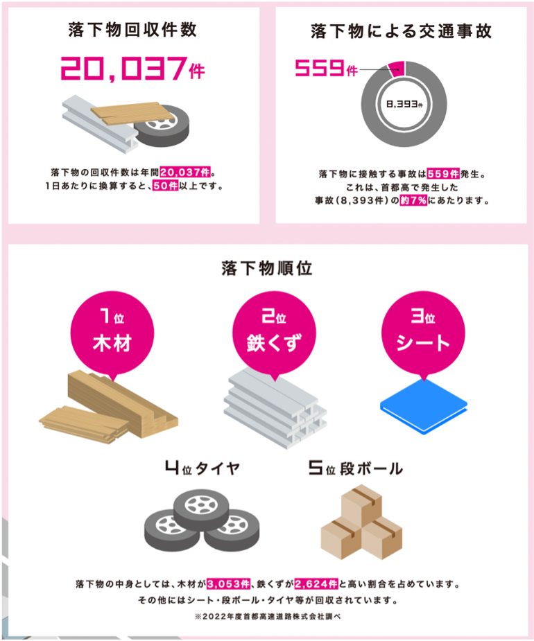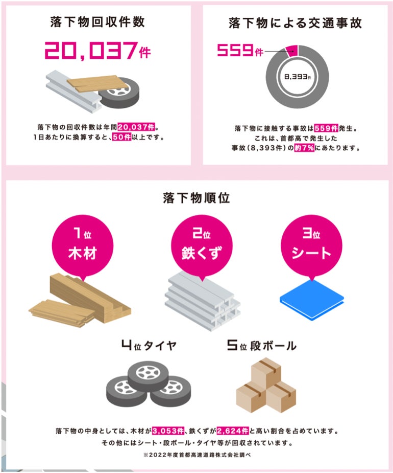 また、落下物の内容としましては、多い順に1位:木材、2位:鉄くず、3位:シート、4位:タイヤ、5位:段ボールとなっております。また、意外なものとしては、シンクやソファ、工事現場で使われる大型ドリルなどの変わったものも存在します(2022年首都高速道路株式会社発表、及び首都高速道路株式会社への取材より)。