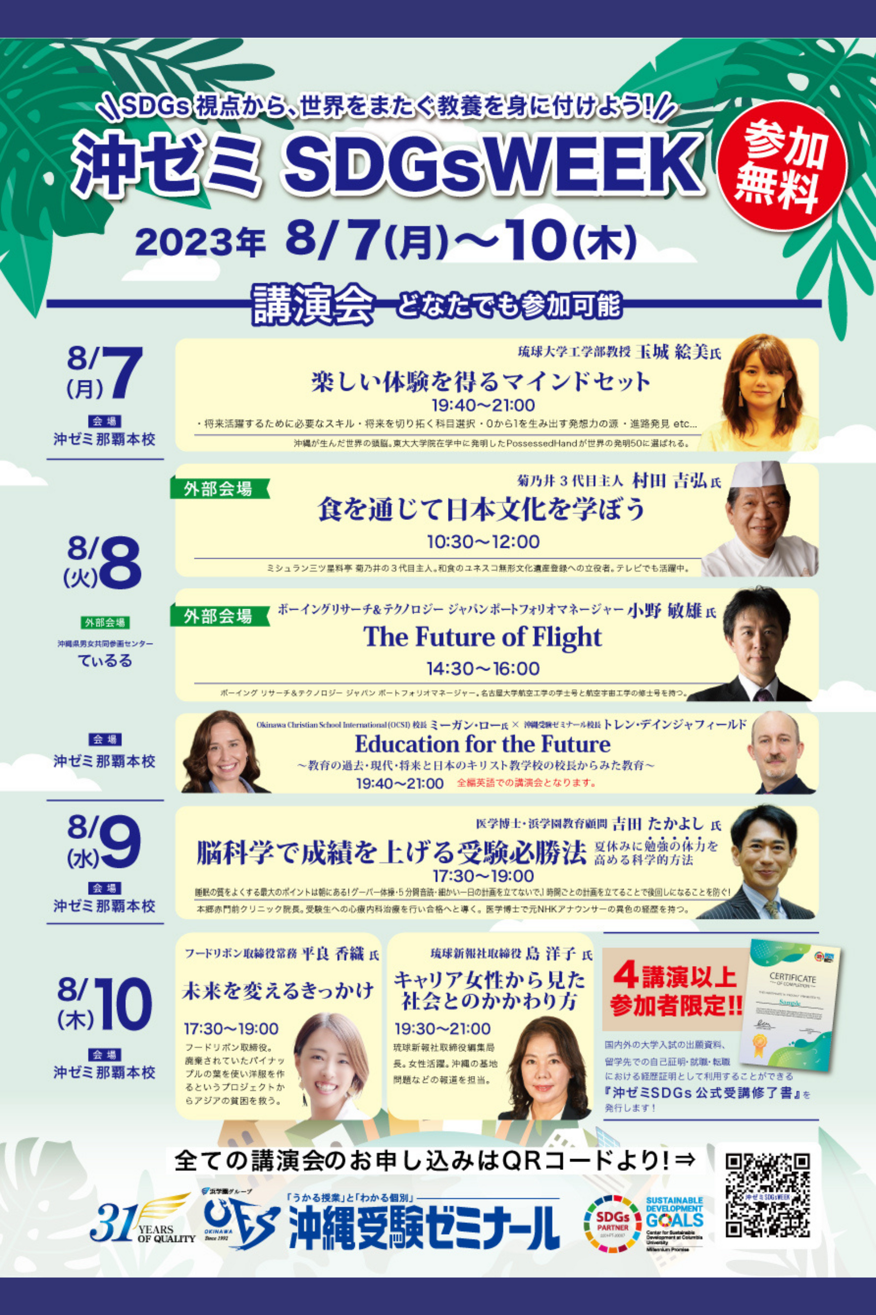株式会社オー・イー・エス(沖縄受験ゼミナール)は全国・世界で活躍する7人の講師に講演を依頼し沖縄で暮らす学生や一般の方々に広く講演を聞いてもらえるSDGsWEEKを開催します。沖縄受験ゼミナールは全国・世界へと目を向け飛躍していく沖縄の学生を応援しています。その一環としてSDGsWEEKでは沖縄出身の玉城絵美教授をはじめ、様々な分野で活躍される方々の講演会を企画。学生だけでなく一般の方でも参加可能となっています。