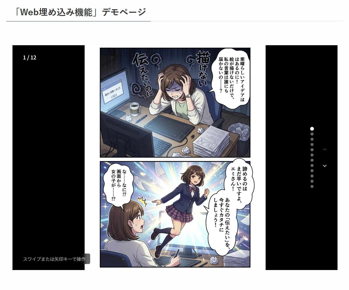 発行される埋め込みコードをコピー&ペーストするだけで、WordPressなどのブログや自社Webサイト上に、作成したMangaNowの漫画をスムーズに表示させることができます。