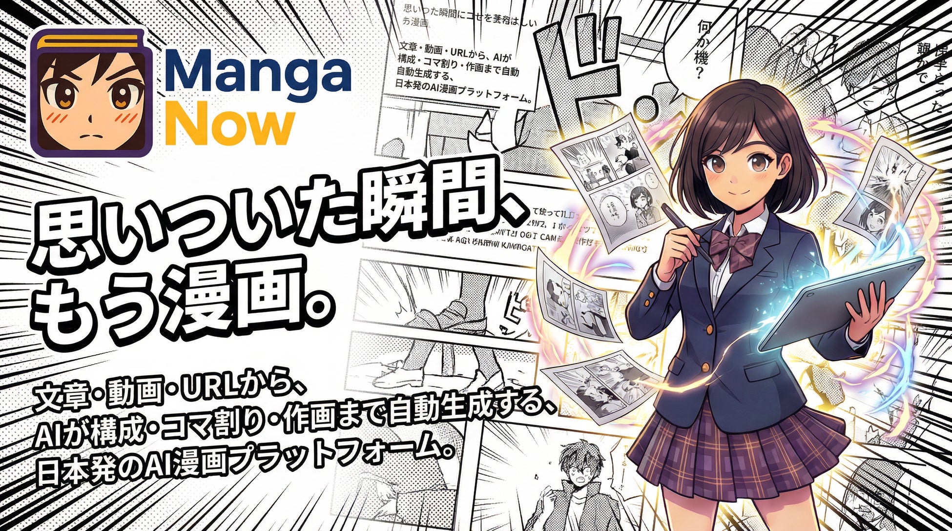 URL/動画/音声/テキストから自動漫画化: 情報を入力するだけで簡単7ステップで構成・コマ割り・セリフを生成。