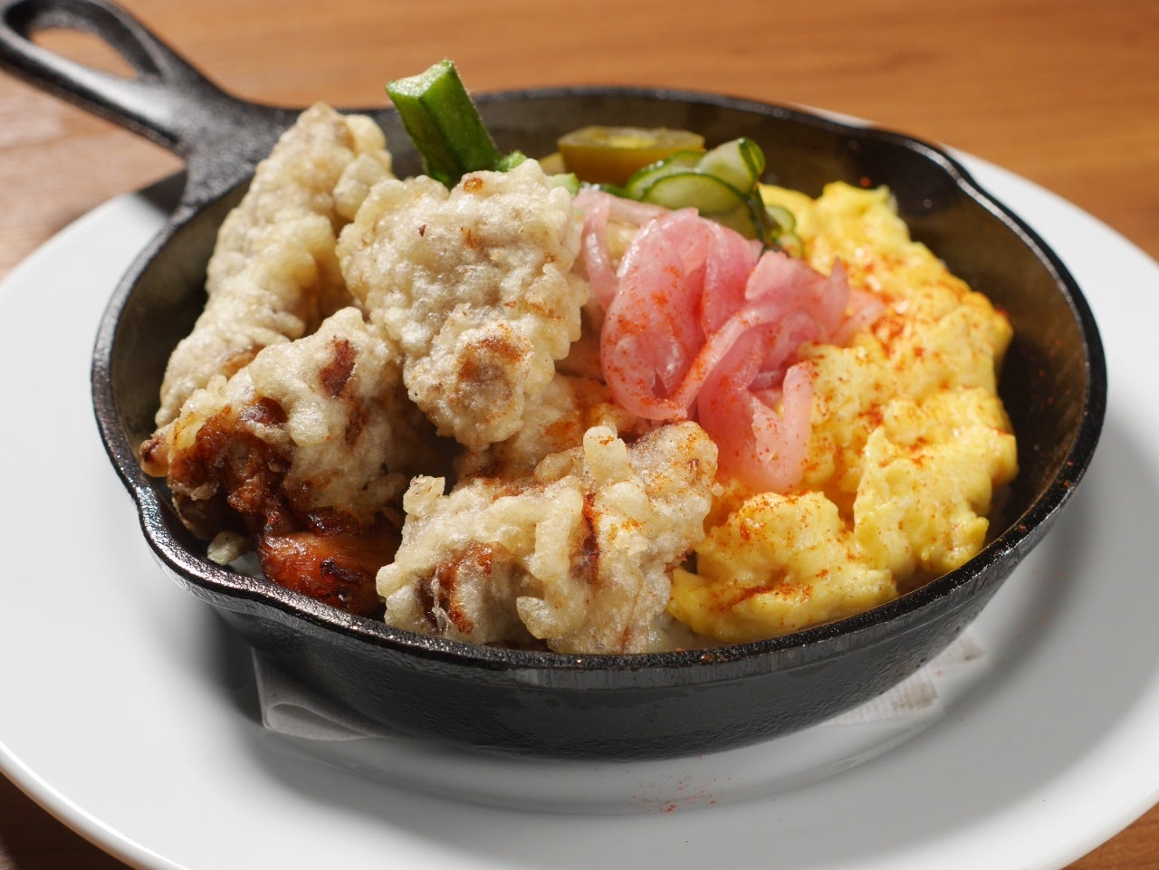 コンフレークの衣をまとったフレンチトーストに、黒ゴマ入りのメープルシロップ、ベーコンとアイスクリームをのせ、甘じょっぱさがクセになるKoko Head cafeの看板メニュー。シェフのリー・アンが幼い頃に食べていたハンバーガーチェーン店のフレンチトーストをヒントに考案。