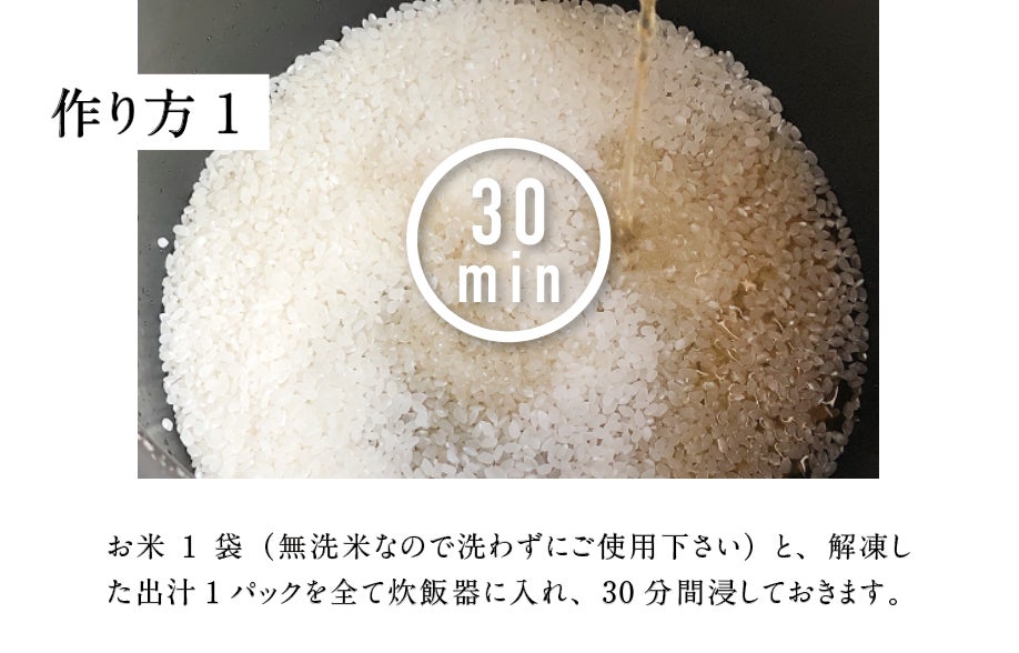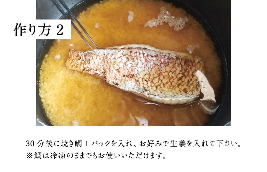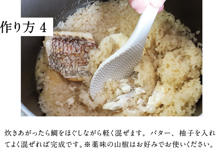ご家庭の炊飯器に同封の具材(お米、鯛の切身、出汁、生姜)を入れて炊飯のスイッチを押すだけで、本格的な鯛めしが出来上がります。また、手軽さだけでなく、バター、山椒、柚子と三種類の薬味をご用意しましたので、味の変化を楽しみながら最後まで飽きることなくお召し上がりいただけます。