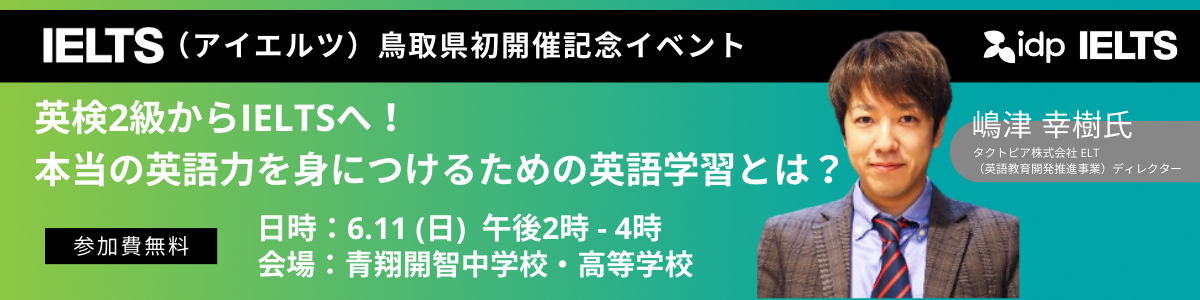 本イベントは、鳥取県近郊の中高生、その保護者そして英語教育関係者を対象にしており、英検2級の先の目標としてIELTSを目指す意義と具体的な勉強方法について理解を深めることを目的にしています。