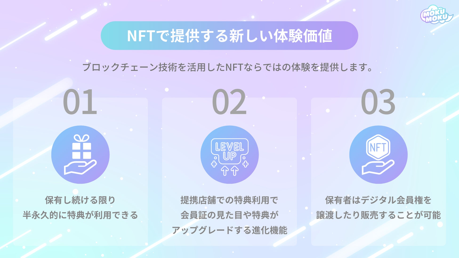 MOKUMOKUが提供するデジタル会員証は、NFT技術を活用し、保有者に特典やサービスへの限定アクセス権の付与や、保有者コミュニティへの参加などができる会員権になります。