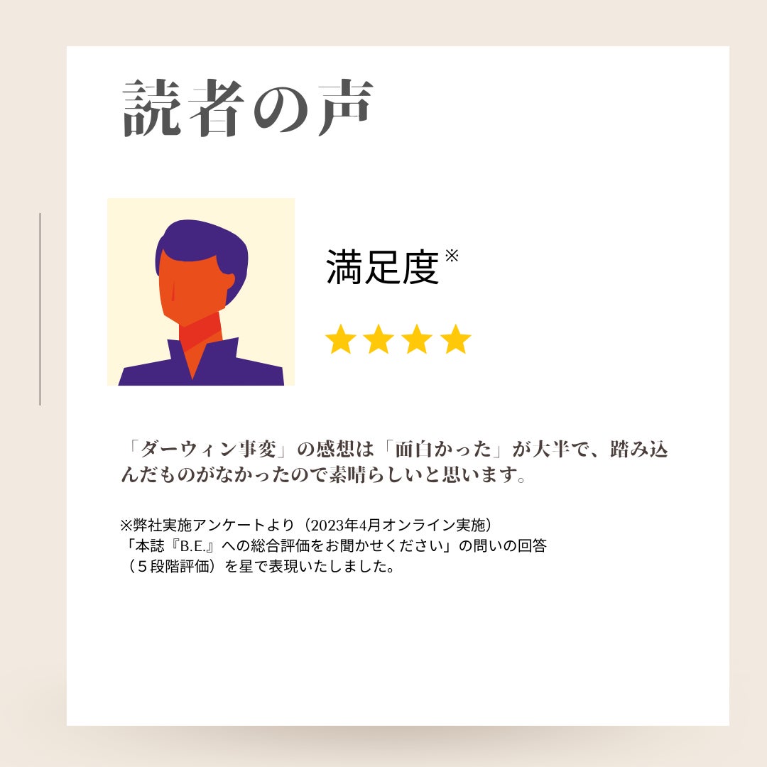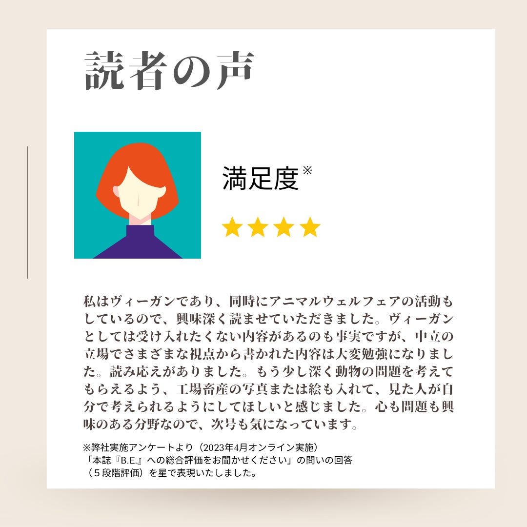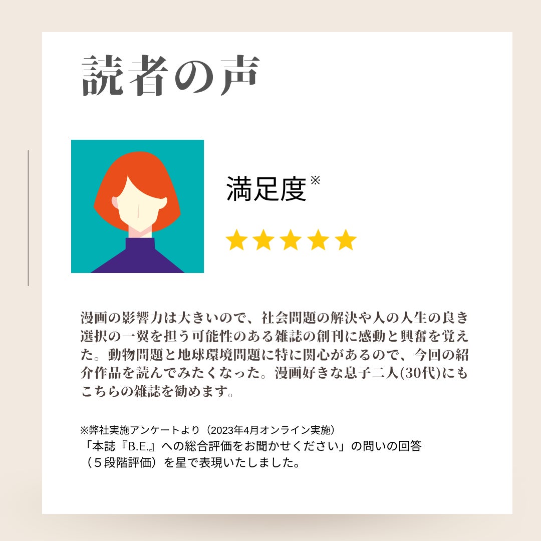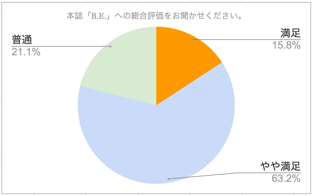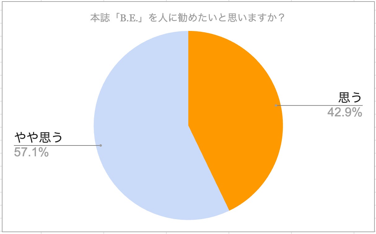 この度、B.E.春号の読者に対してアンケートを実施いたしましたので、内容をご紹介させていただきます。是非、今度購入をご検討される際の判断材料としていただけますと幸いです。