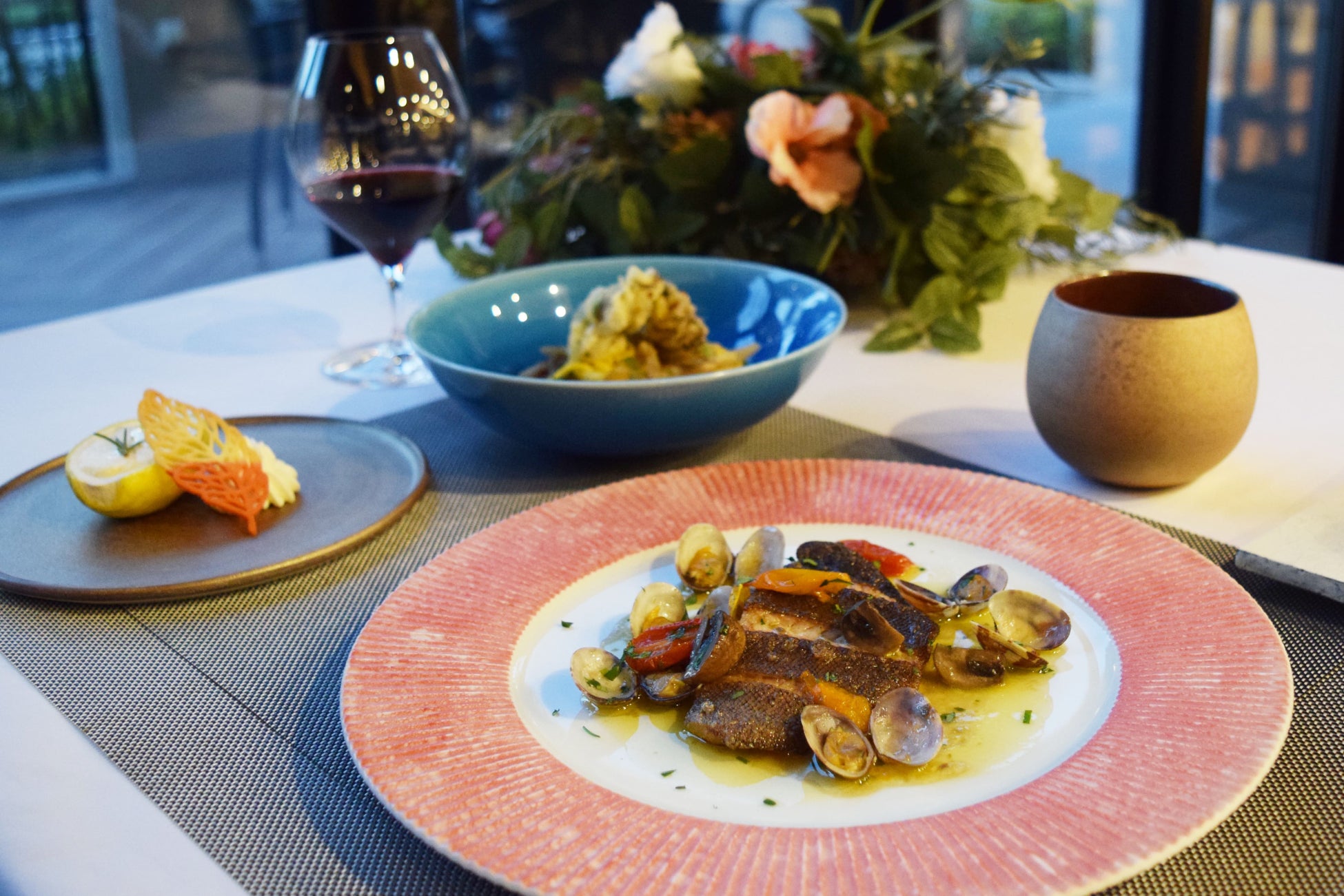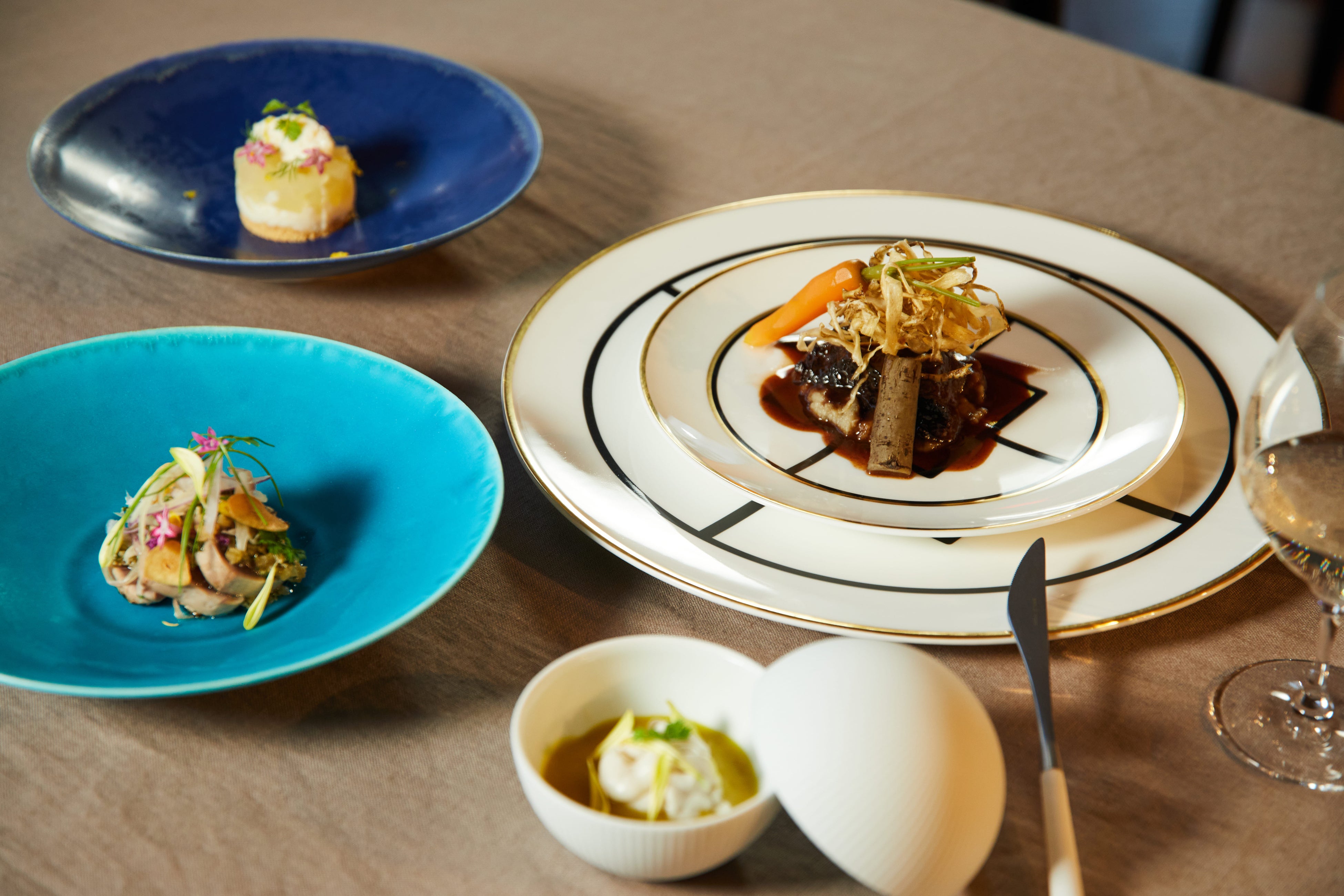 果物を使った前菜や食材のフレーバーを使った生パスタ、メインの肉料理は岐阜県産の飛騨牛を使用。ディナーの締めくくりは野菜を使ったデザートをご提供致します。こだわりの食材を使ったメニューを、陶芸家の作家さんと制作した色とりどりのオリジナルの器に盛り付け、地域に根差したこの土地ならではの食体験を提供致します。