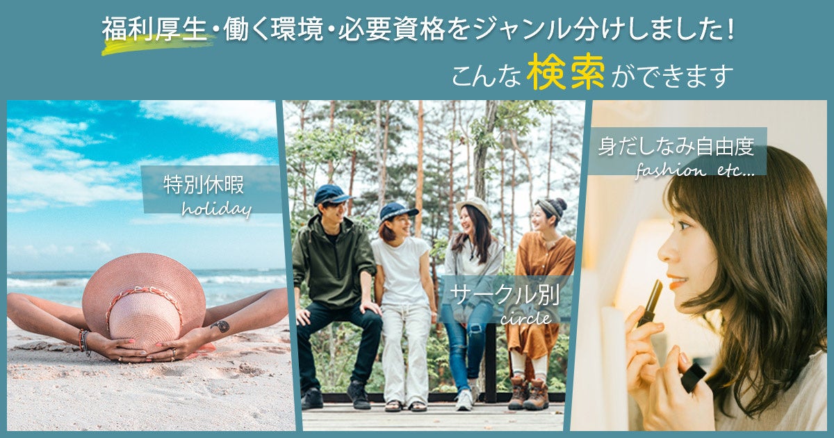 1.「法定外福利厚生・休日休暇・出産育児介護・服装の自由度・働き方・野球などのサークル別・必要資格等」全16ジャンルから検索