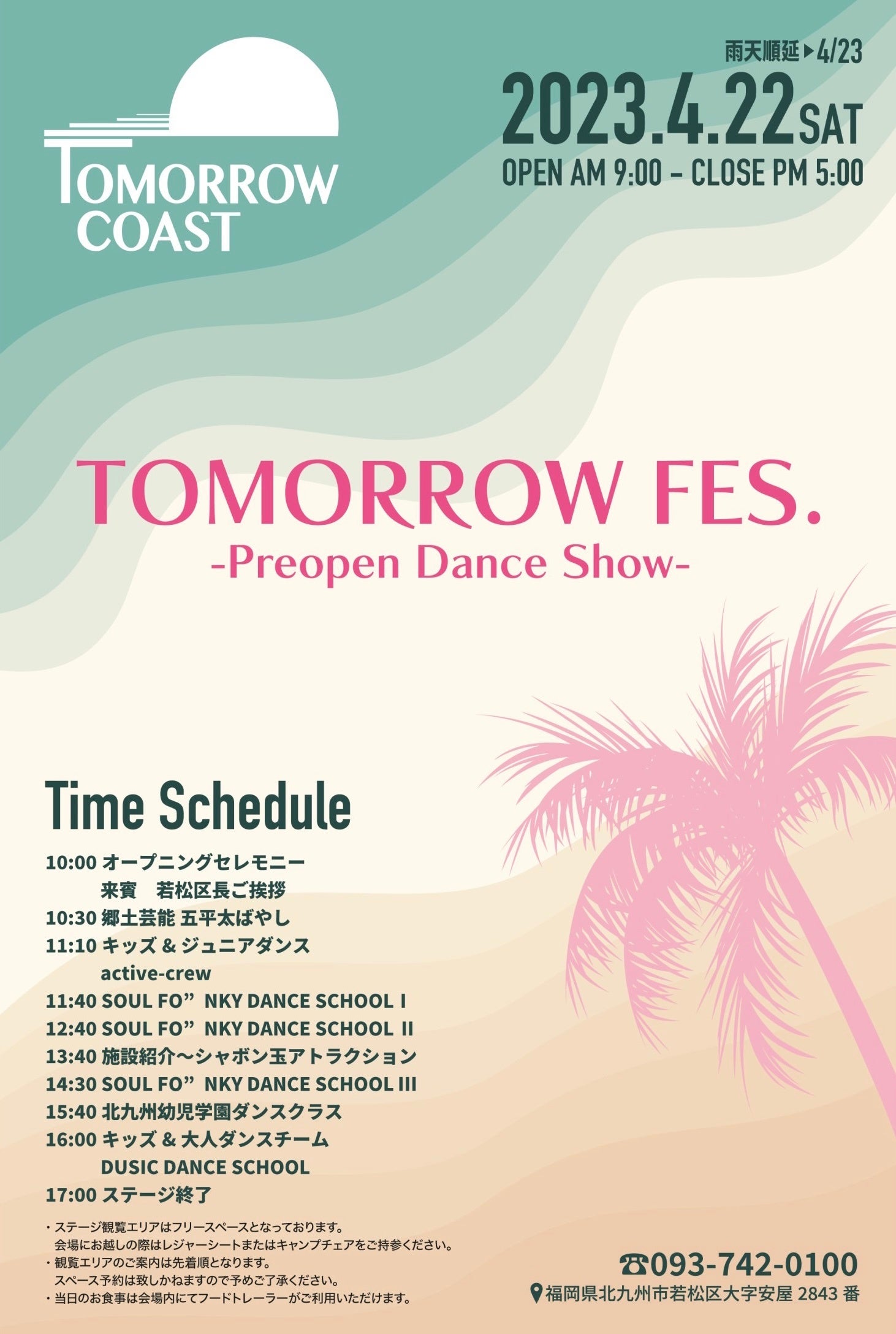 TOMORROW COASTのオープンを記念して2023年4月22日(土)に初となるイベントを開催します。第1部では若松区の郷土芸能「五平太ばやし」やK-pop・ヒップホップなど多彩なジャンルの地元ダンスチームが一挙集結して、ステージを盛り上げます。第2部では楽曲「マカナアロハ」が NHK みんなの歌にも使用された音楽ユニット「Chiyo Tia」が出演し、TOMORROW COASTの美しいサンセットにぴったりなハワイアンミュージックをお届けします。