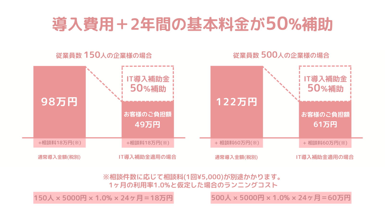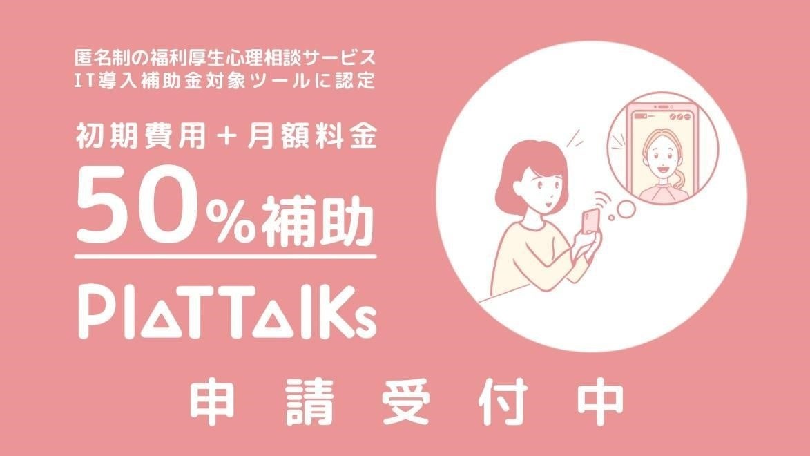 補助対象となるITツールは、当社が提供する心理相談サービス「Plattalks(プラットトークス)」です。今回の採択により「Plattalks」を導入される中小企業・小規模事業者等の皆様は、初期導入費用+2年分の月額基本料金の50%の補助金の交付を受けていただくことができるようになります(交付には審査があります)。今まで以上に皆様のビジネスに「Plattalks」を導入いただきやすくなりました。