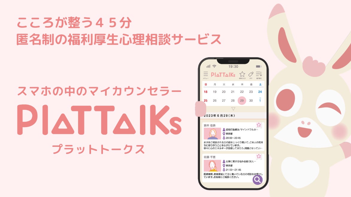 「Plattalks」は、契約法人の従業員が福利厚生として利用できる心理カウンセリングアプリです。企業における働き方・休み方の仕組みづくりを行う「社会保険労務士」と個人のメンタルヘルスに心理面から関わる「心理士」が共創・運営する日本唯一のサービスです。