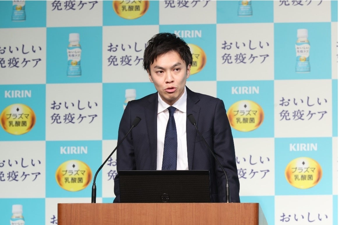 当日は、キリンビバレッジ株式会社小西裕太より、キリングループのヘルスサイエンス事業の取り組みや『キリン おいしい免疫ケア』の販売状況を発表しました。