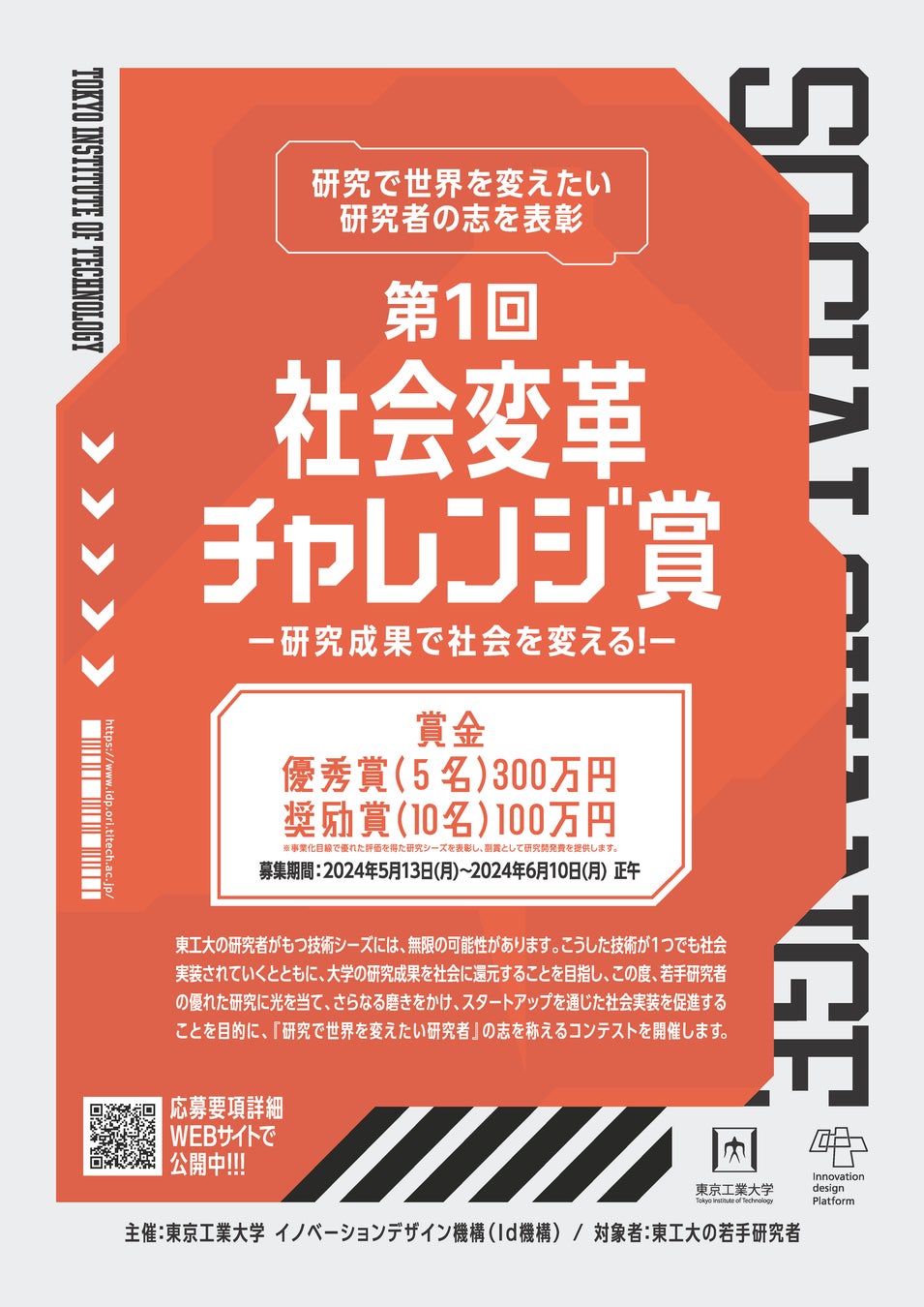 東京工業大学(以下「東工大」)のスタートアップ支援部門であるイノベーションデザイン機構(機構長:辻本 将晴、以下「Id機構」)は、高い意欲と優れた研究シーズをもつ若手研究者によるスタートアップの創出を目指して「社会変革チャレンジ賞」を2024年4月に創設します。