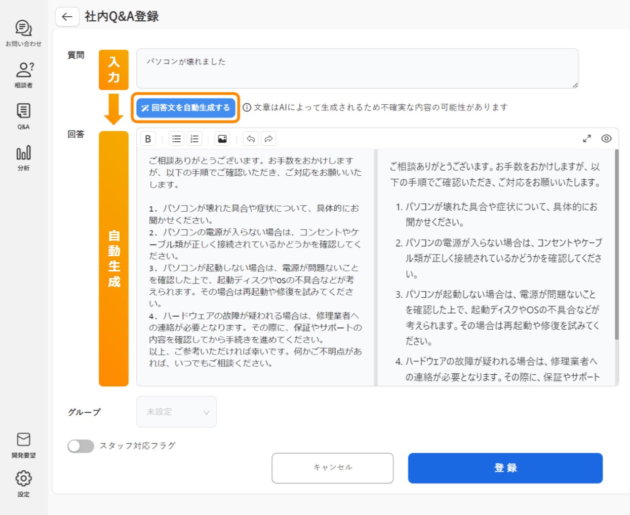 今回追加される新機能は、自動応答の際に使用されるQ&Aを、半自動で作成するものです。新たにQ&Aを登録する際は、これまでは、質問と回答の双方をいちから作成する必要がございました。これからは、質問を入力した後はワンクリックで、回答のドラフトが生成されるようになります。