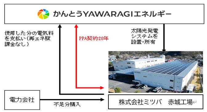 かんとうYAWARAGIエネルギー株式会社(代表取締役 三村挑嗣、以下「当社」)は株式会社ミツバ(代表取締役 北田勝義、以下「同社」)と2023年6月にオンサイトPPA*モデルによる契約を締結し、同社赤城工場の屋上に太陽光発電システムの設置を進めてまいりましたが、この度設置が完了し、再生可能エネルギー電力の発電を開始しましたので、下記のとおりお知らせいたします。