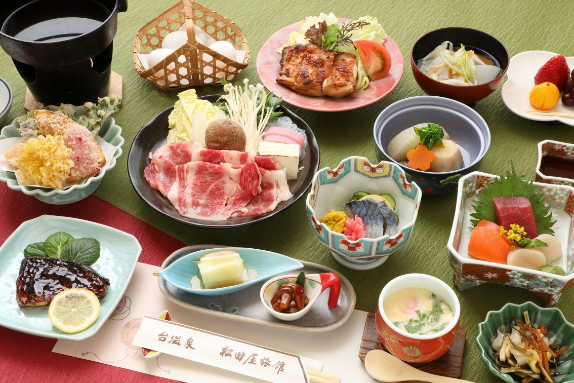 温泉を堪能した後は、旬の食材を取り入れた創作和食でおもてなし。山菜や野菜をたっぷり使った前菜からスタートし、岩手県産牛や旬菜の天ぷらなど、山里海の幸を満喫できます。会食場は個室食事処で、大切な方と水入らずでゆっくり満喫いただけます。
