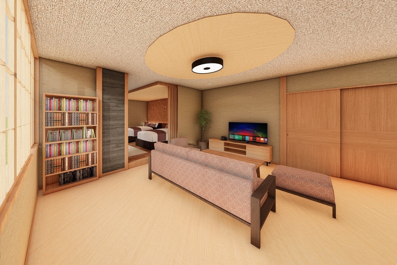 新オープン。70平米の和洋室、地元作家の書籍が楽しめる書棚付きリビング+かけ流し温泉付き客室が新登場。