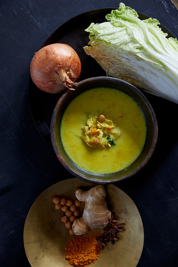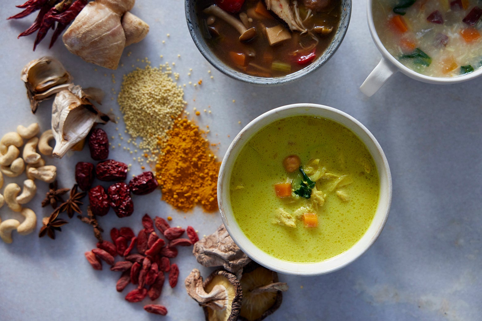 ・鶏肉と生姜のターメリック豆乳スープ…豆乳のまろやかななかにもしっかり効かせたスパイスのコントラストが楽しい主役スープ。乾燥野菜の触感もシャキシャキ。諸外国で産後ケア食材として重宝されるターメリックで