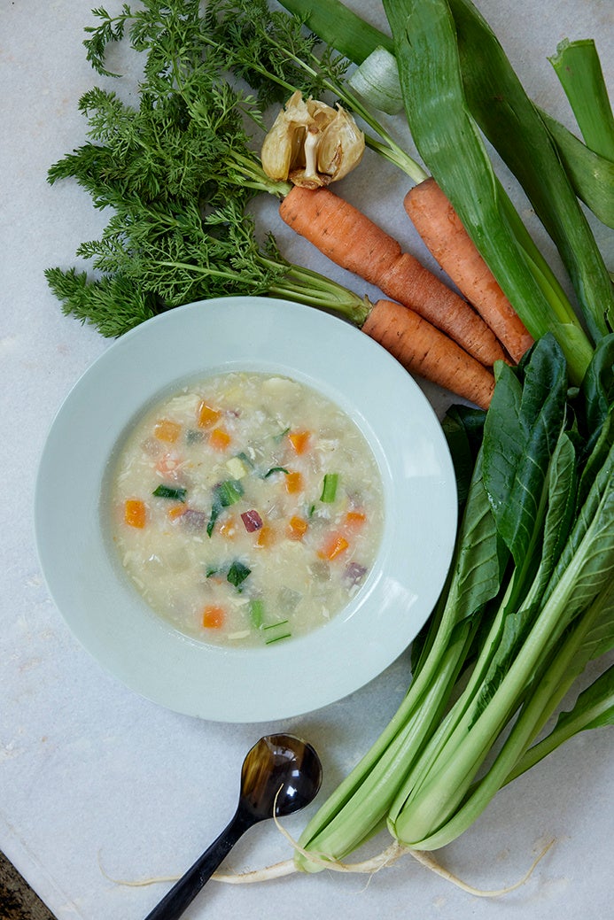 ・たっぷり野菜のにんにくおかゆ…消化しやすいお米に野菜と根菜を加えたおかゆ。味の薄いおかゆに物足りなさを感じる方にうれしい風味です。βカロテン豊富な緑黄色野菜と消化をサポートするにんにくで、産後の栄養補給に。