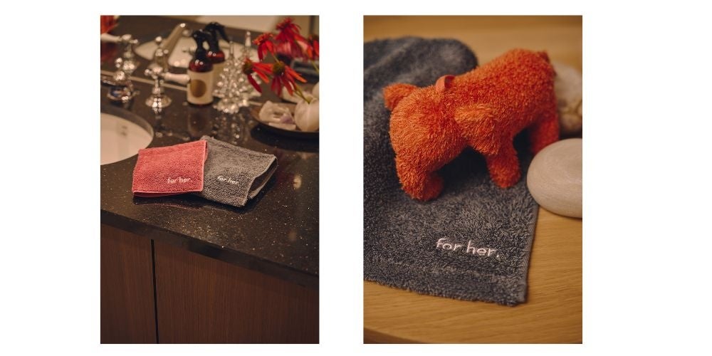 そんなfor her.にとって初めてのコラボとなる今回の発売は、オーガニックコットンを使用し、赤ちゃんのお肌に触れたり、お口に入っても心配がなく、出産祝いにもらって嬉しいもの、贈り手も安心して選べるものとして人気のタオルブランドHippopotamusとのスペシャルギフト。