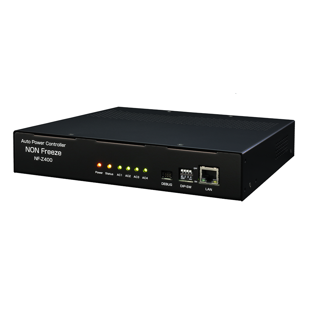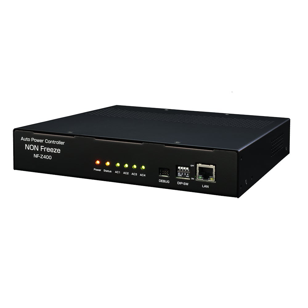 当社ではこれらネットワーク機器のフリーズを検知して自動復旧できる商品(NONフリーズ)を提供しておりますが、この度、4台のネットワーク機器を同時に死活監視し、自動で再起動できる、モデル「NF-Z400/JP」が、デジタルサイネージ市場へのソリューションとして最適であると考え、提案を開始いたします。