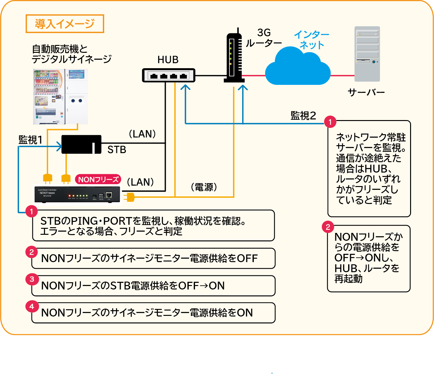 Point2 監視は「PING監視」と「PORT監視」にて行います。サイネージのセットトップボックス(以下STB)は、PINGによる監視のみの場合、アプリケーション層でのフリーズは発見できません。NONフリーズを用いてPORT監視を行うことで、プログラムの動作確認も行えます。