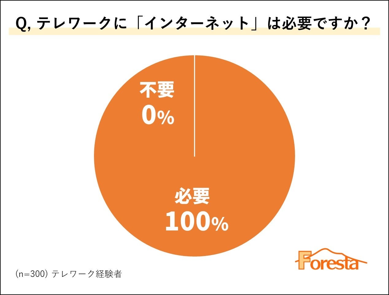 テレワーク経験者に「テレワーク時にインターネットは必要か否か」をアンケートしたところ、300名全員が「インターネットは必要」と回答しました。