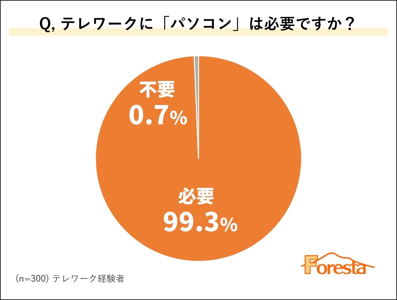 続いて、テレワーク経験者に「テレワーク時にパソコンは必要か否か」をアンケートしたところ、300名のうち99.3%の方が「パソコンは必要」と回答しました。