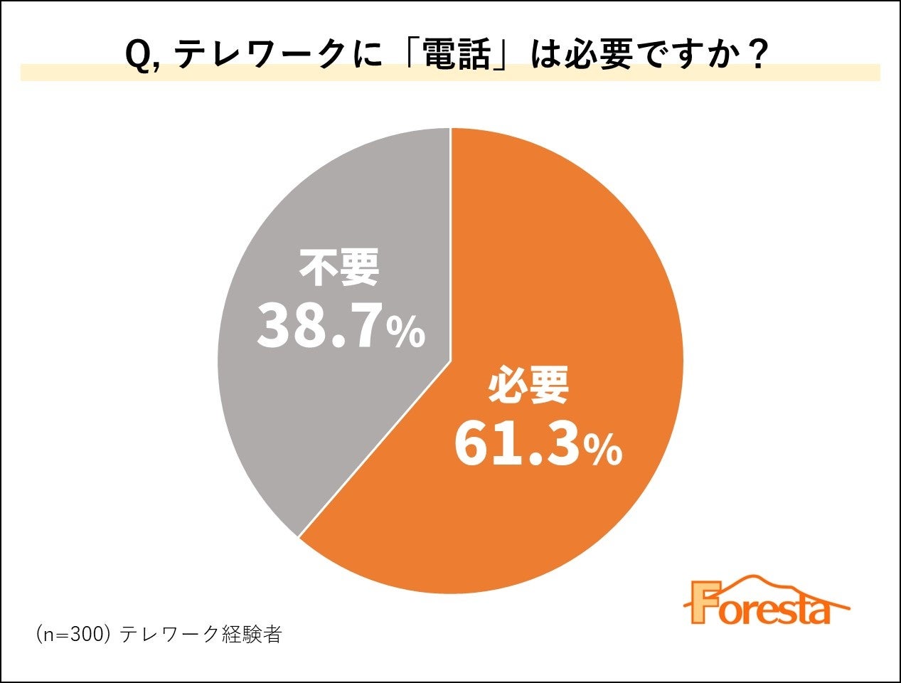 続いて、テレワーク経験者に「テレワーク時に電話は必要か否か」をアンケートしたところ、300名のうち61.3%の方が「電話は必要」と回答しました。