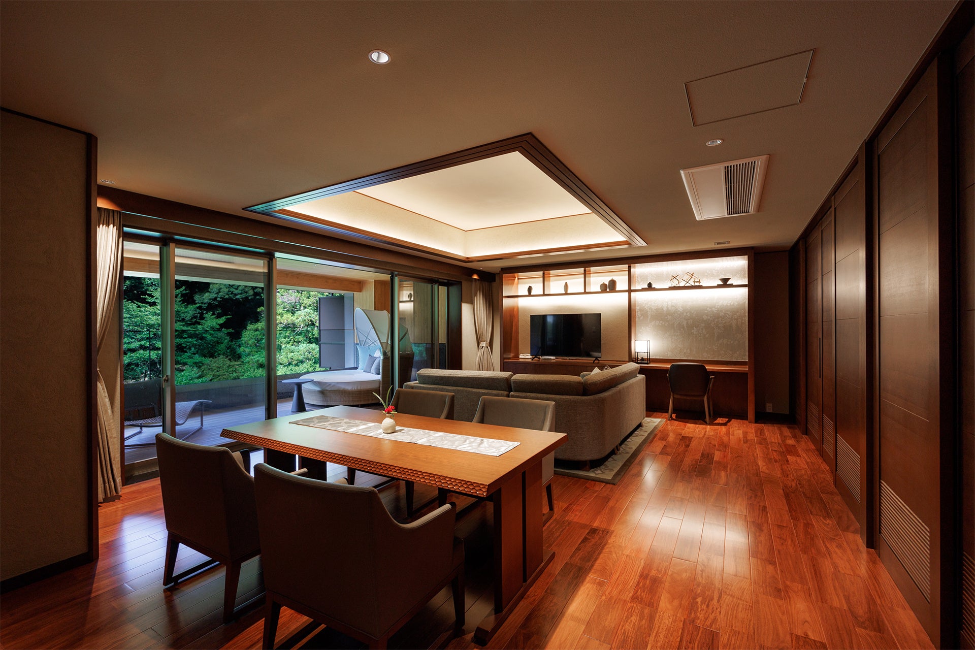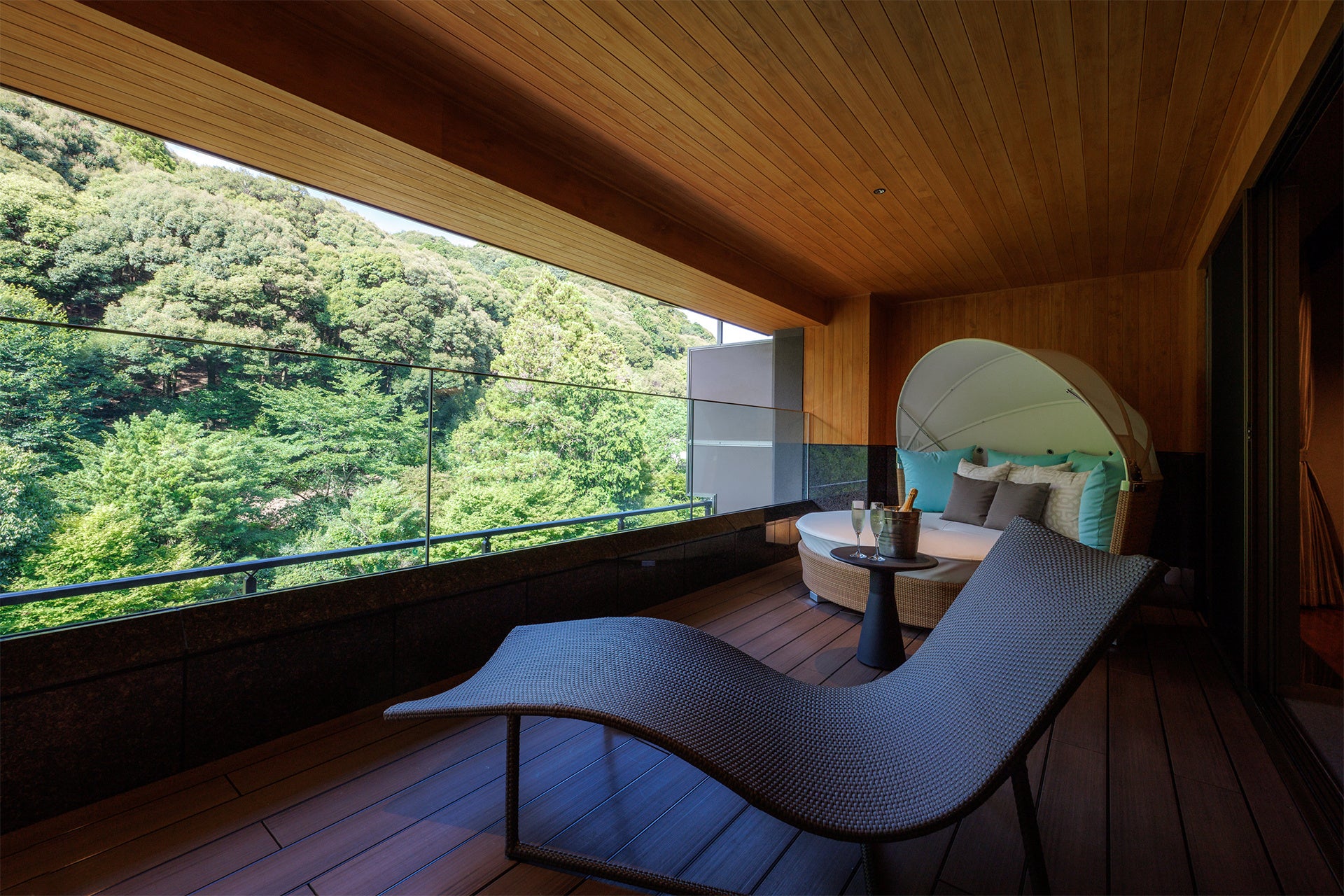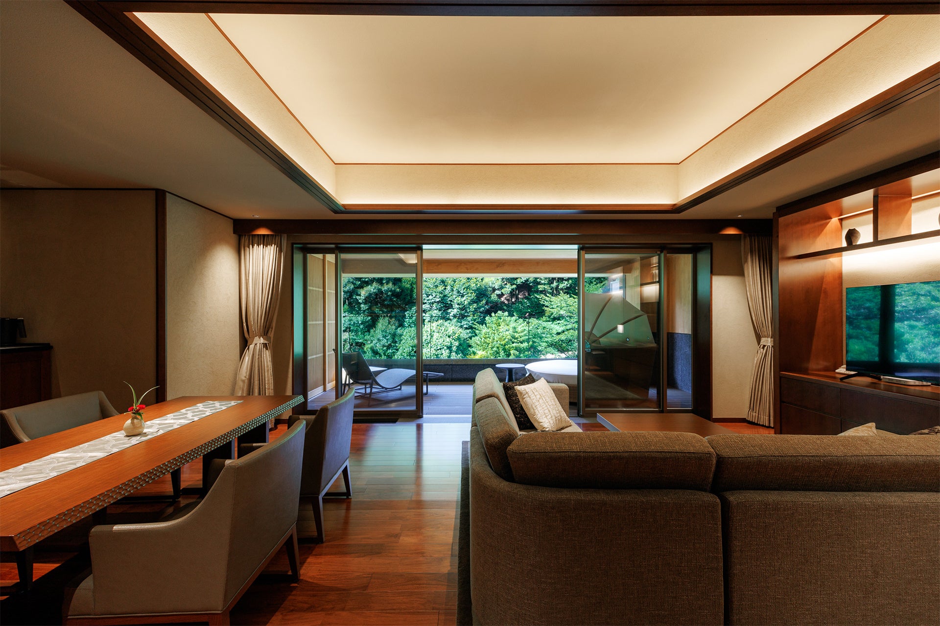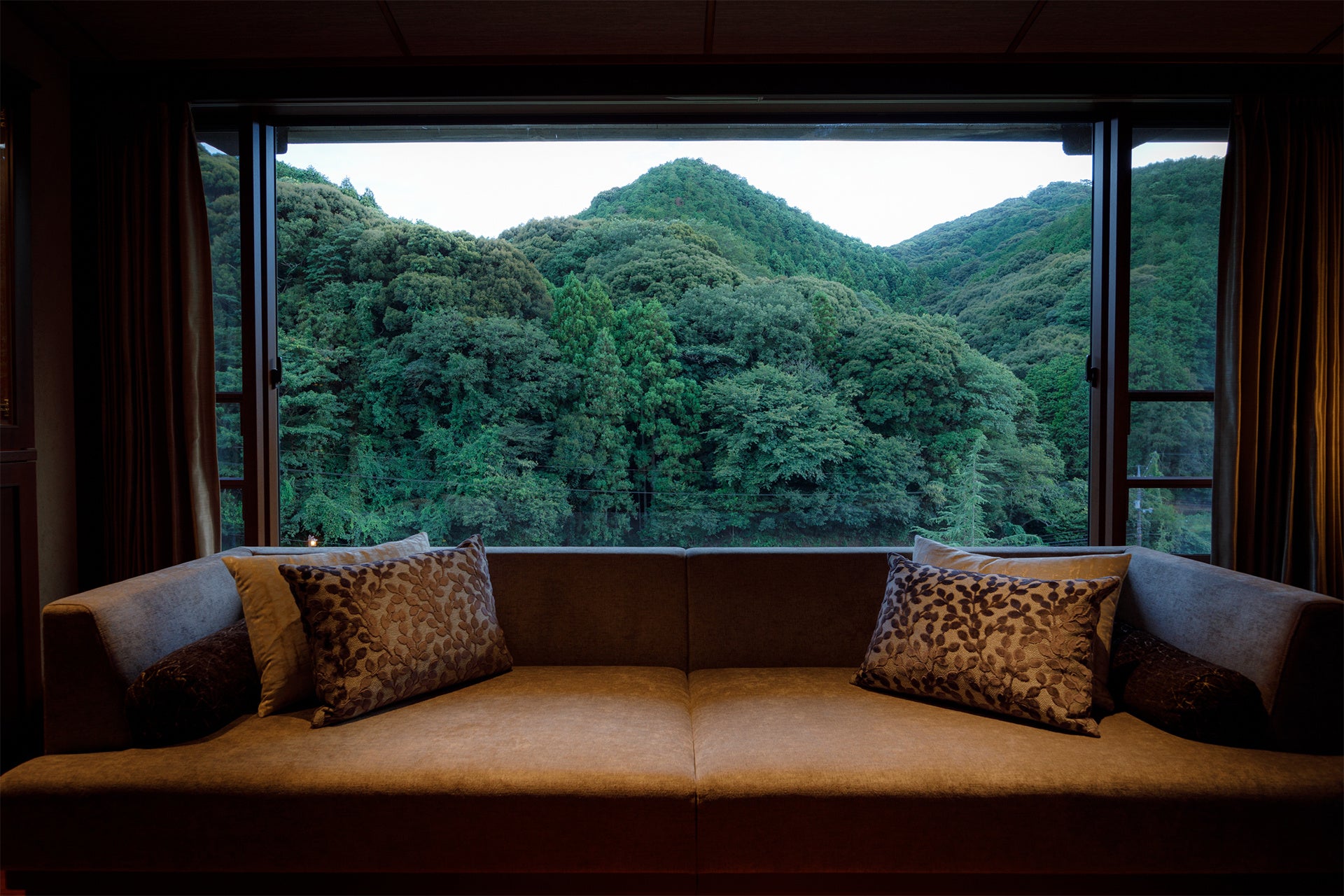 客室奥には庭園を望める大きなテラス窓があり、テラスへ出ると豊かな緑の山々を一面に見渡せます。また、夜には庭園がライトアップされますので、昼とは異なる趣をお愉しみいただけます。テラスに備え付けられたソファは、手足を広げてくつろげる程のゆったりとしたサイズ。露天風呂やサウナで温まった後の外気浴の場としてもおすすめです。