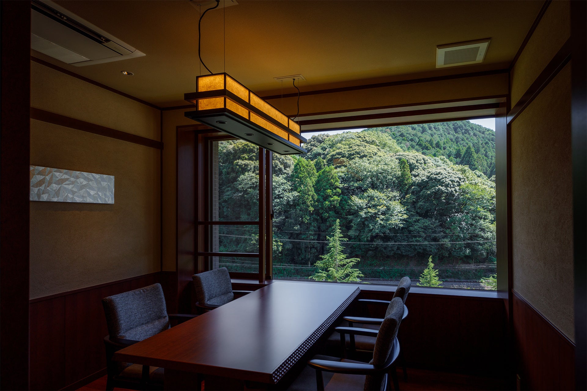大谷山荘曙館に、新たにご夕食会場「個室ダイニング」が誕生いたしました。4名席を基本としたイス・テーブルを配し、各お席には仕切りを設け、レストランスタイルのようでありながらご家族やグループのプライベートな空間を大切にする、個室ダイニングをご用意。露天風呂付き客室専用会席料理の会場としてご案内いたします。
