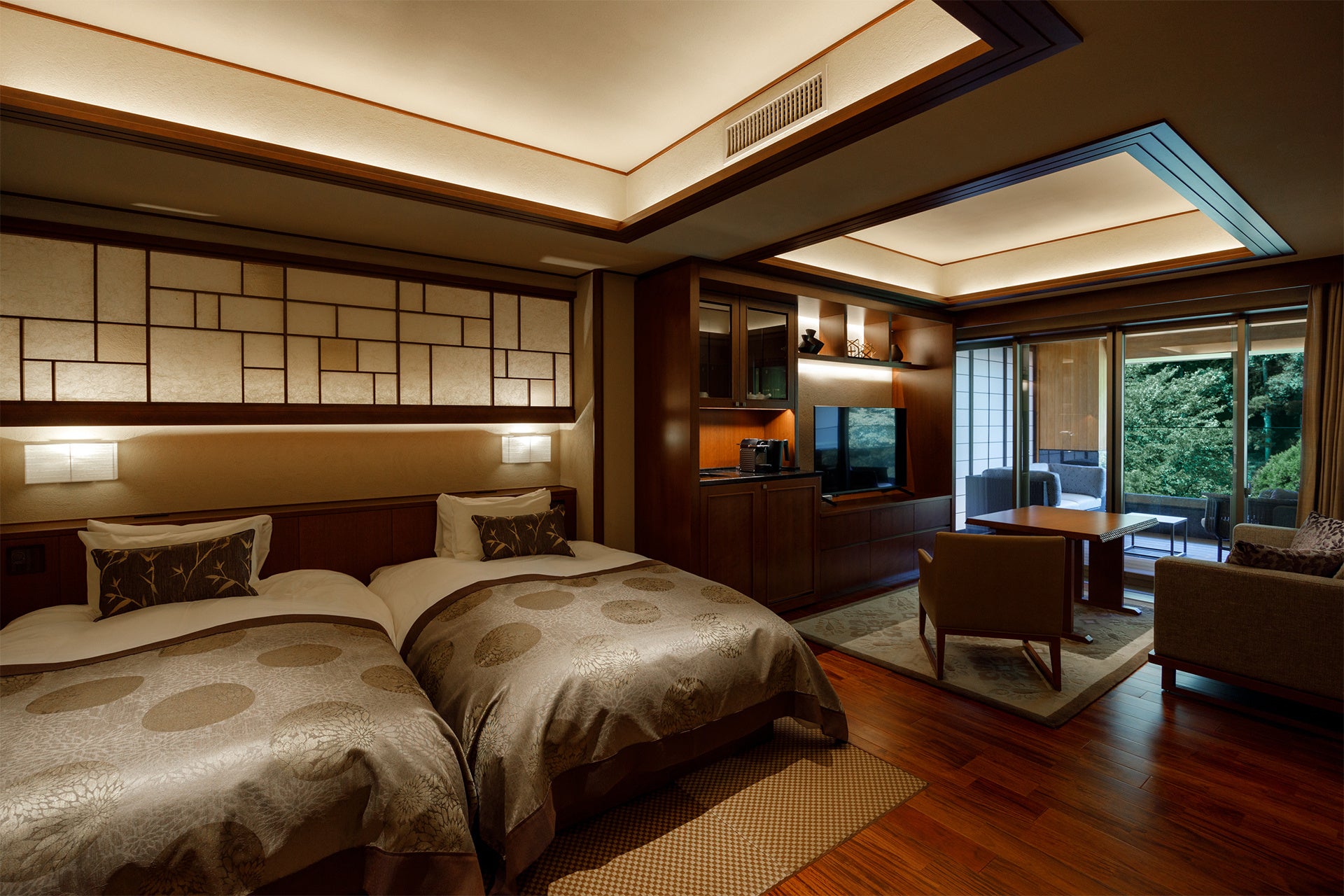 曙館最上階の5階に1室だけの露天風呂付きスイートルーム。約64㎡のワンルーム内にはツインのベッドスペースや、ご歓談やおくつろぎに適したソファを配したリビングスペース、読書などができるワークスペースを備え、奥には自然を感じるテラスを設置。コンパクトながらも様々なシーンでご活用いただけます。2名様定員の客室でございますので、ご夫婦やご友人とのご旅行におすすめです。