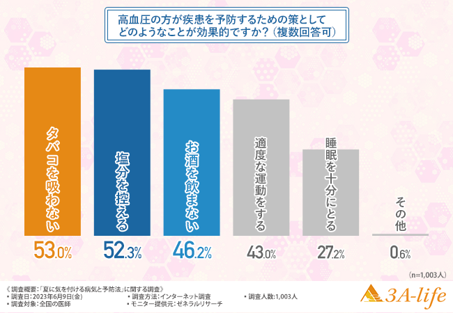 そして、半数以上の医師が高血圧の方が疾患を予防するために有効的な対策は、タバコを吸わないことと思っているようです。