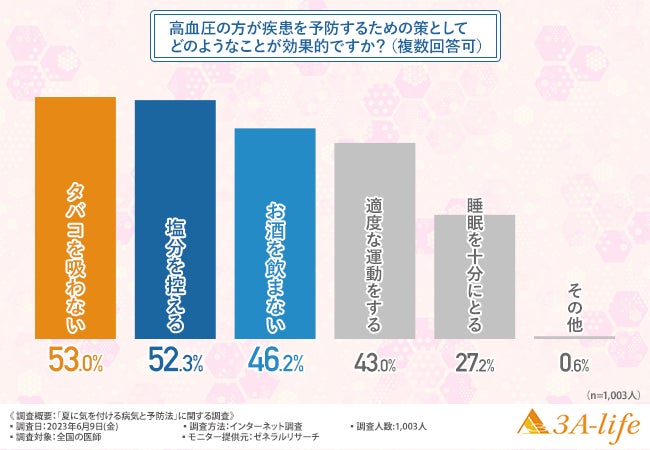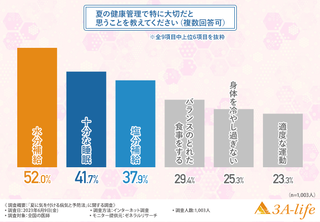 今回、NKCP PLUS(https://cp.3a-life.com/nkcpplus_t)を販売するスリーエー・ライフ株式会社は、全国の医師を対象に、「夏に気を付ける病気と予防法」に関する調査を実施しました。