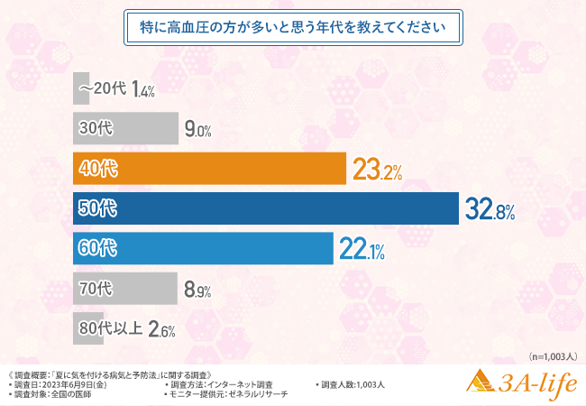 「特に高血圧の方が多いと思う年代を教えてください」と質問したところ、『~20代(1.4%)』『30代(9.0%)』『40代(23.2%)』『50代(32.8%)』『60代(22.1%)』『70代(8.9%)』『80代以上(2.6%)』という回答結果になりました。