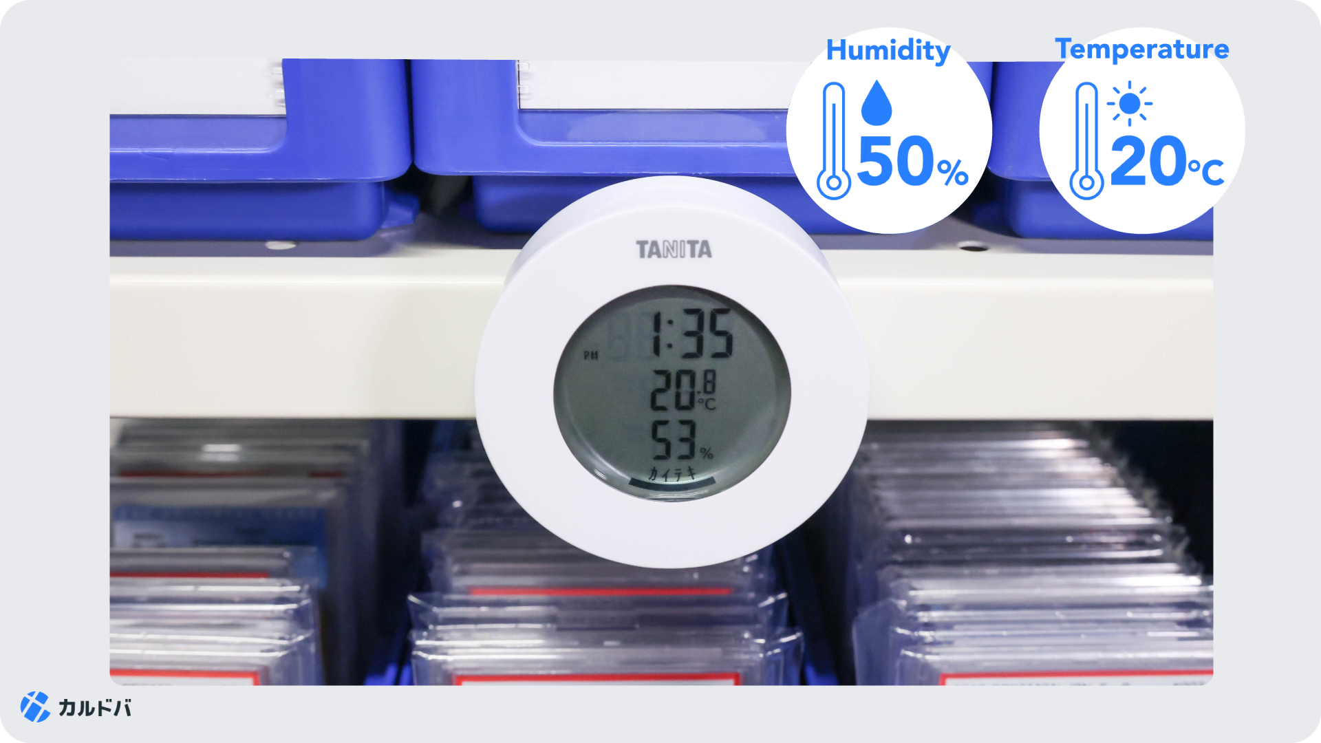 鑑定済みトレカをカルドバにお送り頂くことで、美術品のように最適な温度、湿度【室温20°C、湿度50%】で保管し、貴重なカードを経年劣化から守ります。さらに警備会社と提携し、保管庫や事務所には防犯カメラも完備。24時間365日、高セキュリティな防犯体制を敷き、万が一の盗難や災害に備えた補償制度も設けております。